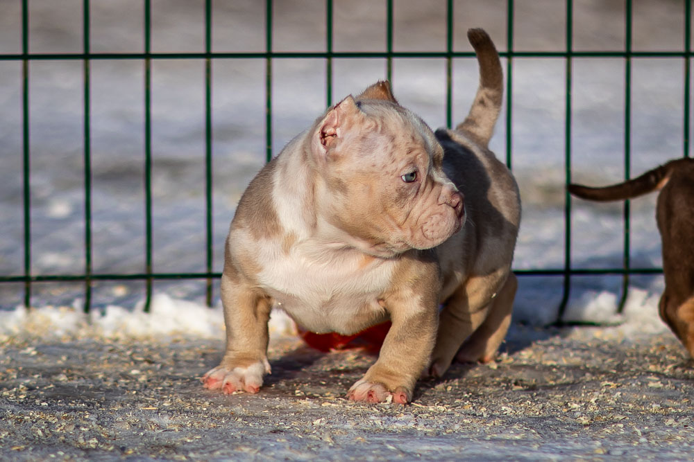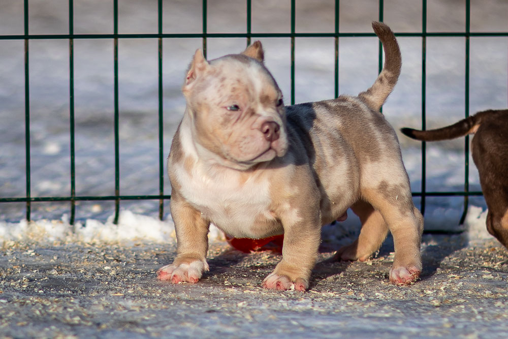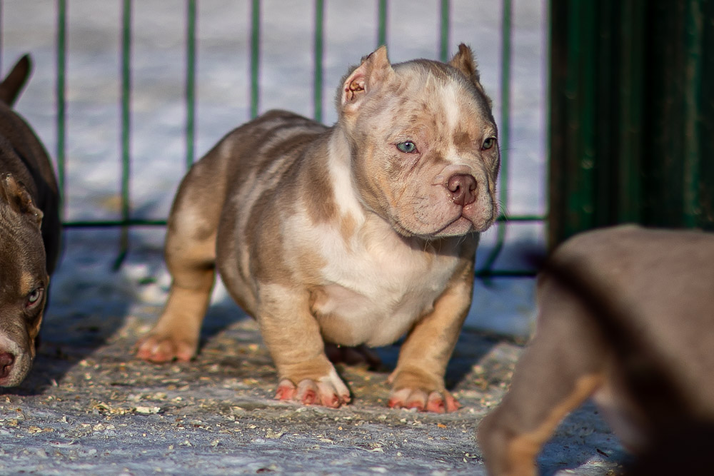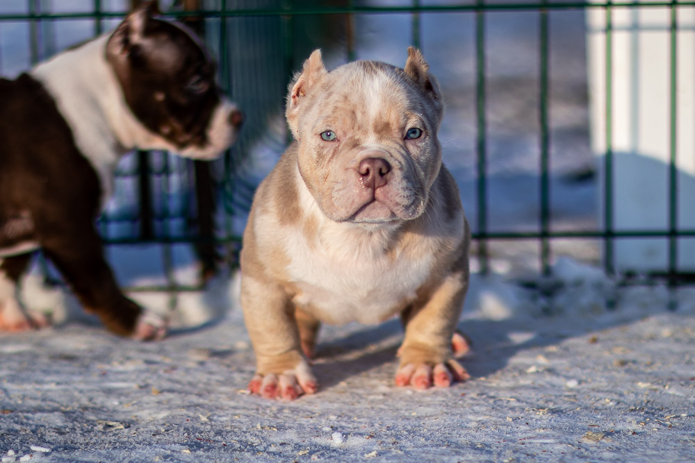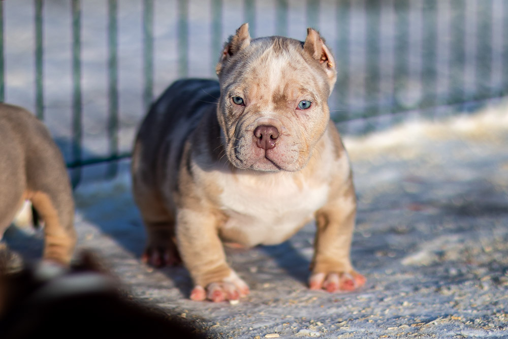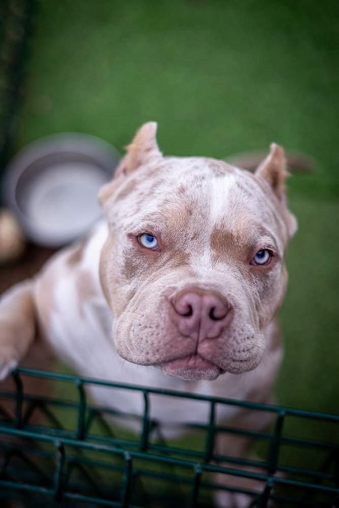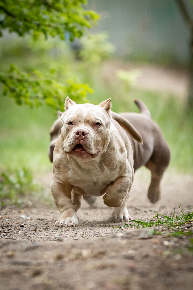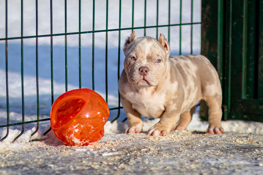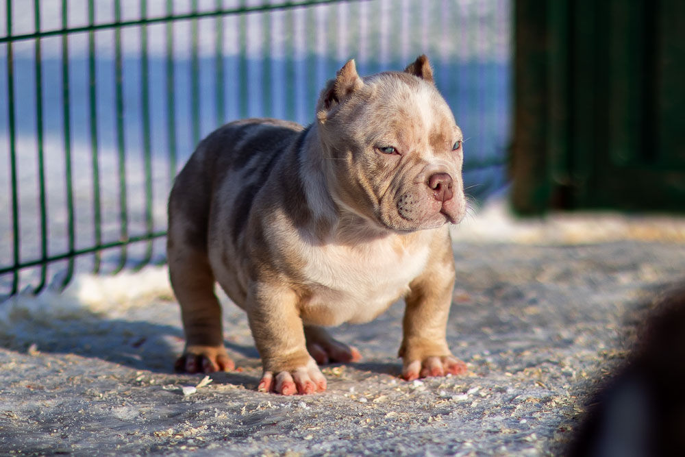 В три месяца Леон уже поражает своей мощью. Широкая грудь, которая почти касается пола, мощные плечи, ровная спина — в нём всё говорит о силе, которая с возрастом раскроется ещё больше. Но не только телосложение делает его особенным. Его голубые глаза притягивают взгляд, в них есть что-то большее, чем просто щенячье любопытство — глубина, которая завораживает.