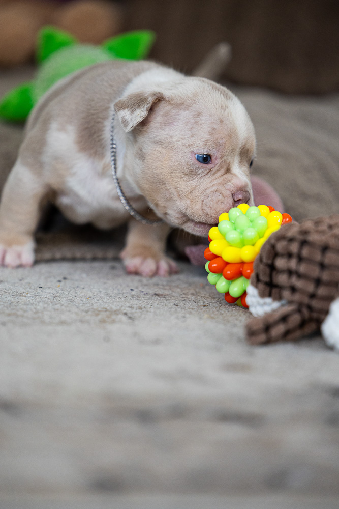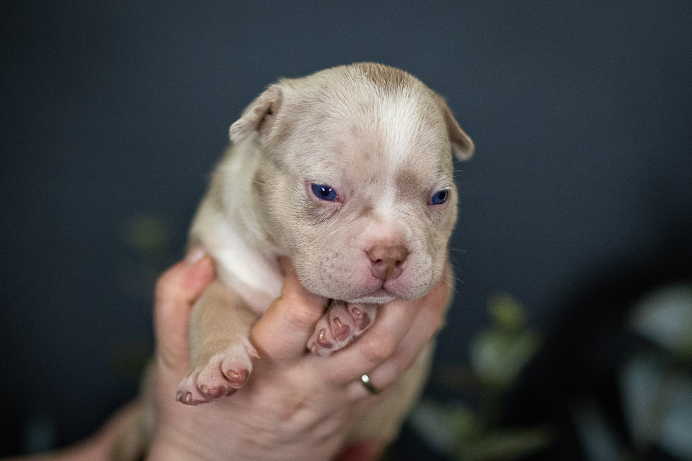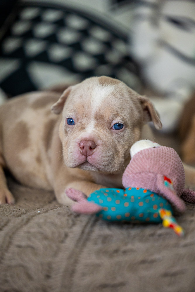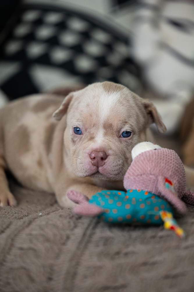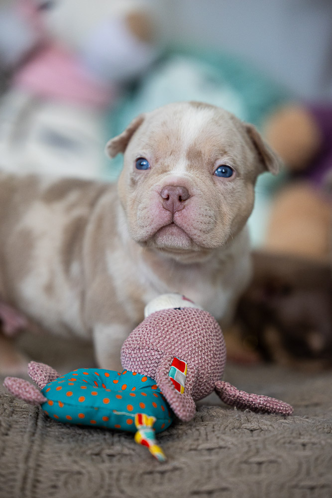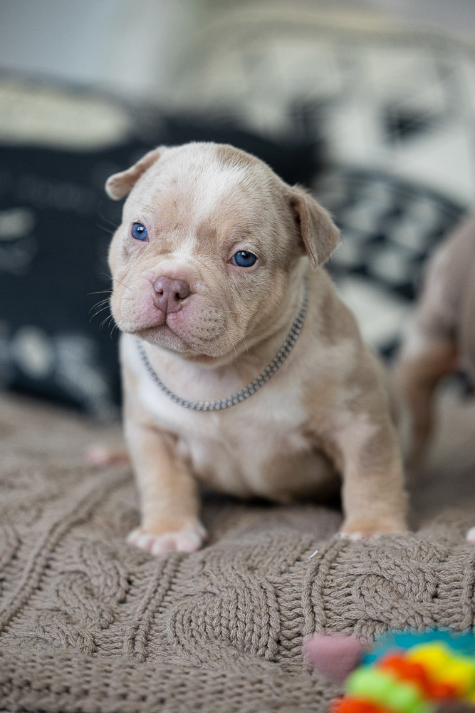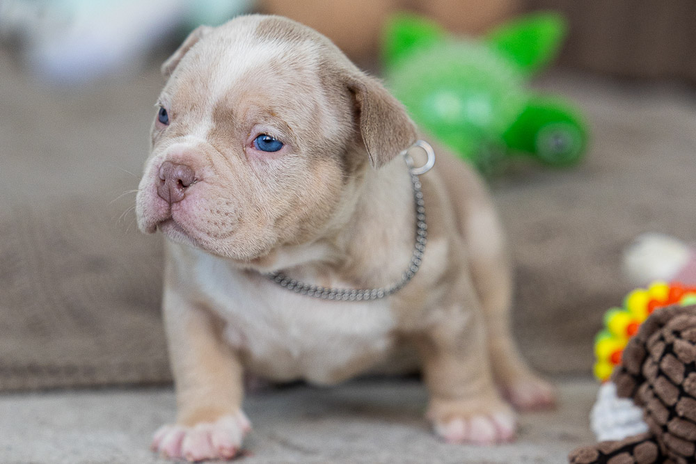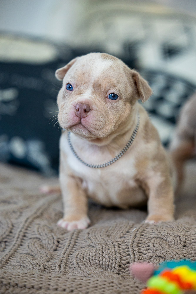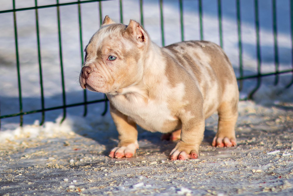 В три месяца Леон уже поражает своей мощью. Широкая грудь, которая почти касается пола, мощные плечи, ровная спина — в нём всё говорит о силе, которая с возрастом раскроется ещё больше. Но не только телосложение делает его особенным. Его голубые глаза притягивают взгляд, в них есть что-то большее, чем просто щенячье любопытство — глубина, которая завораживает.