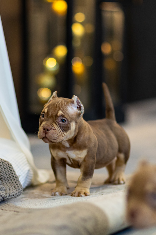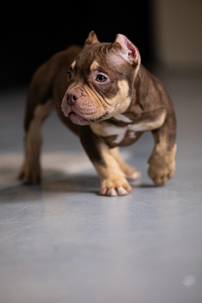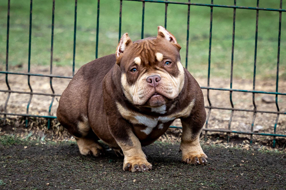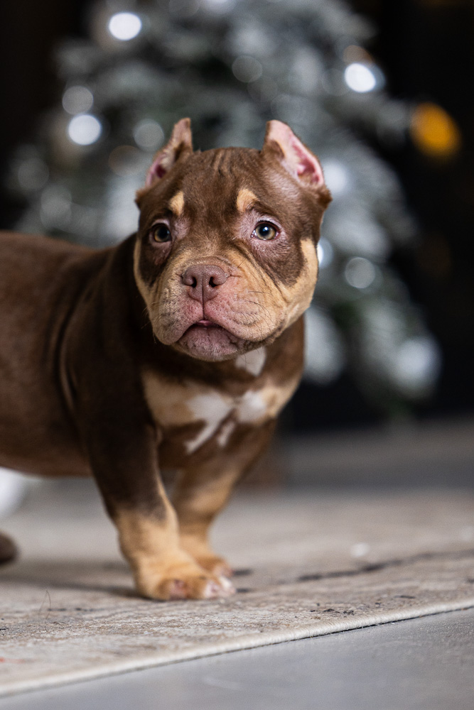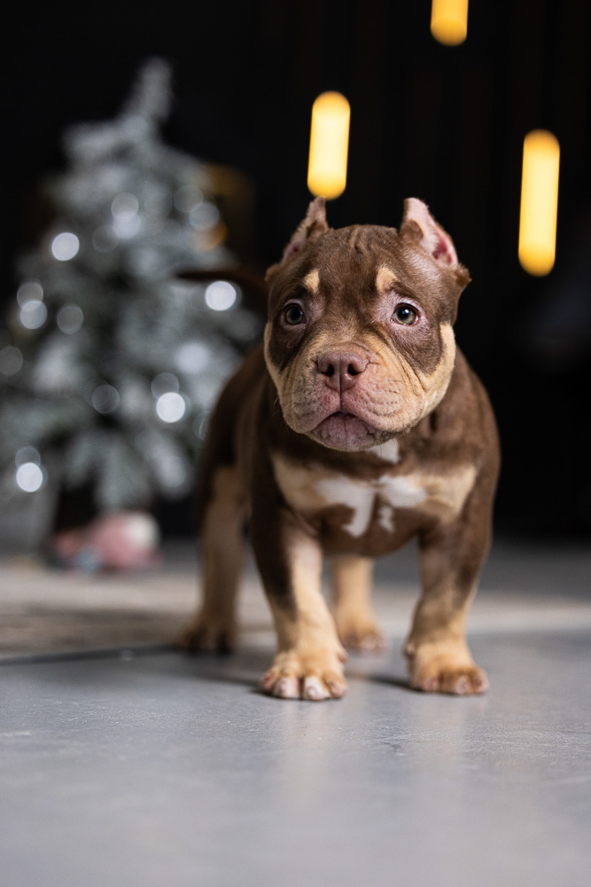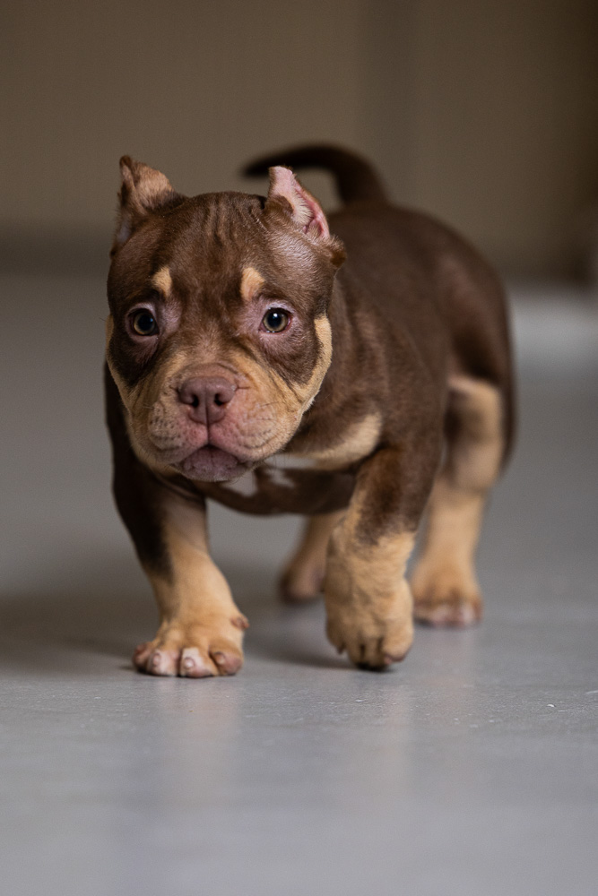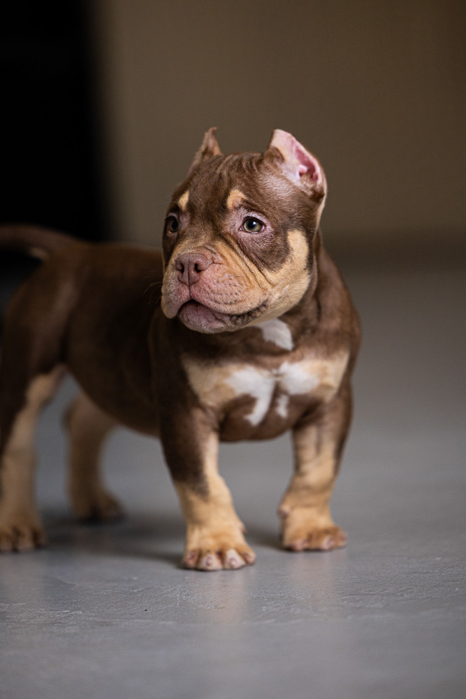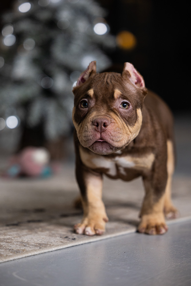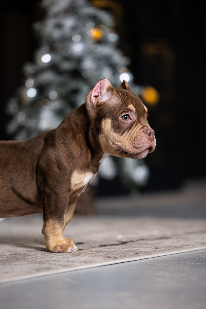 Этот мальчик – настоящая шоколадная находка! Он сочетает в себе атлетизм, выразительную мускулатуру и невероятную харизму. Уже в свои 5 месяцев он демонстрирует ярко выраженные объемы, мощные мышцы и крепкий костяк, что делает его перспективным представителем породы.