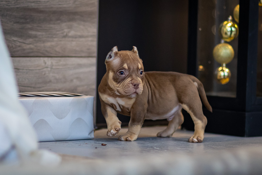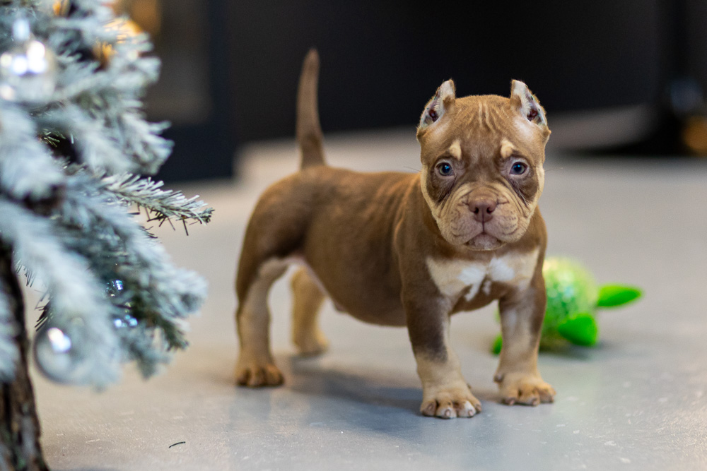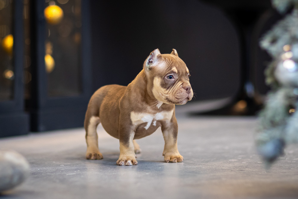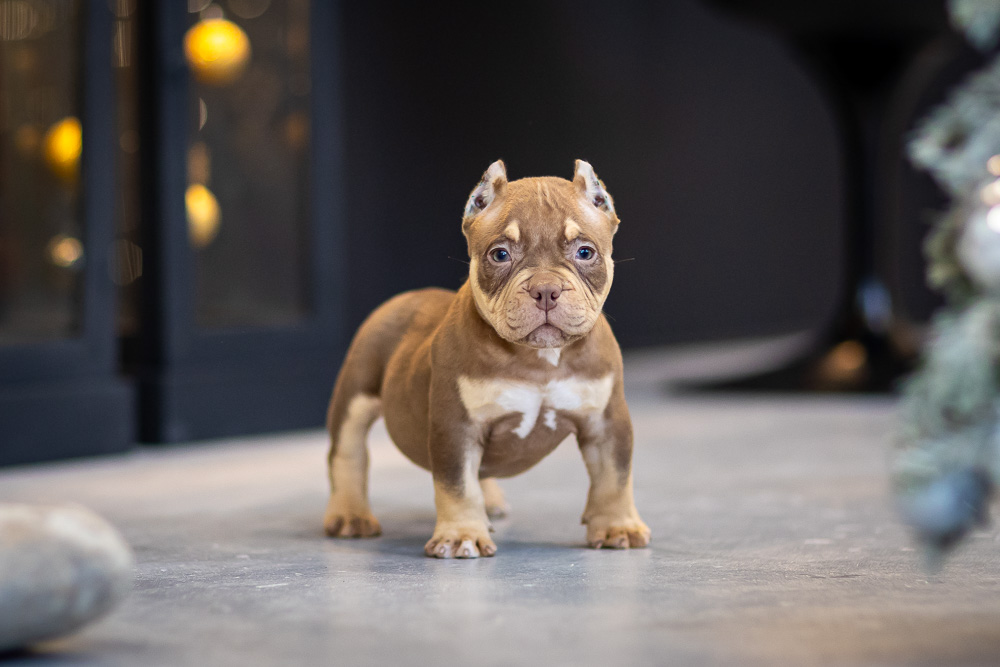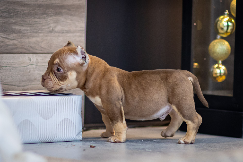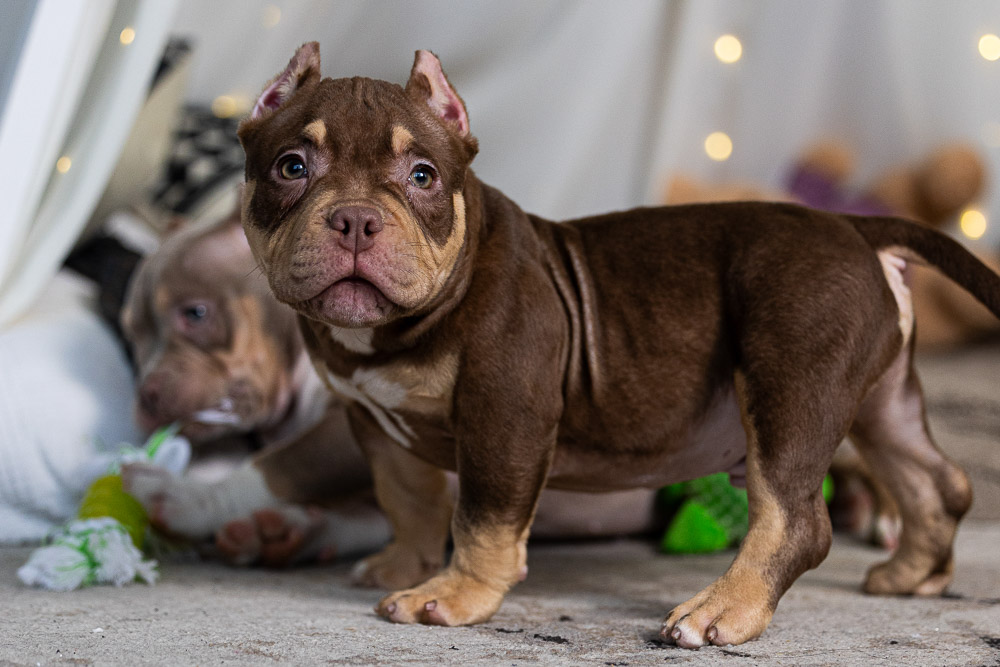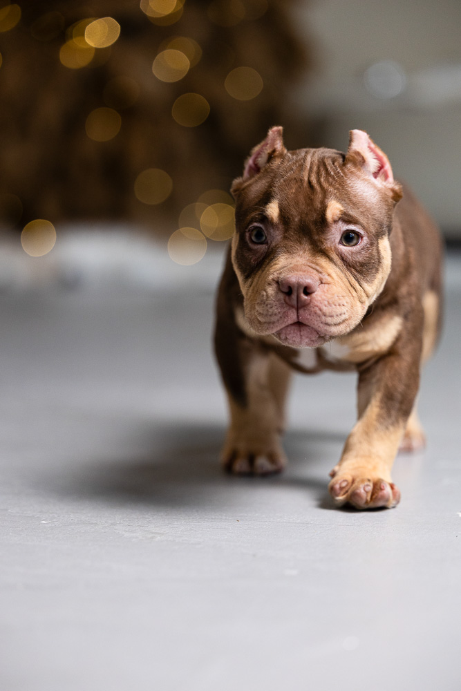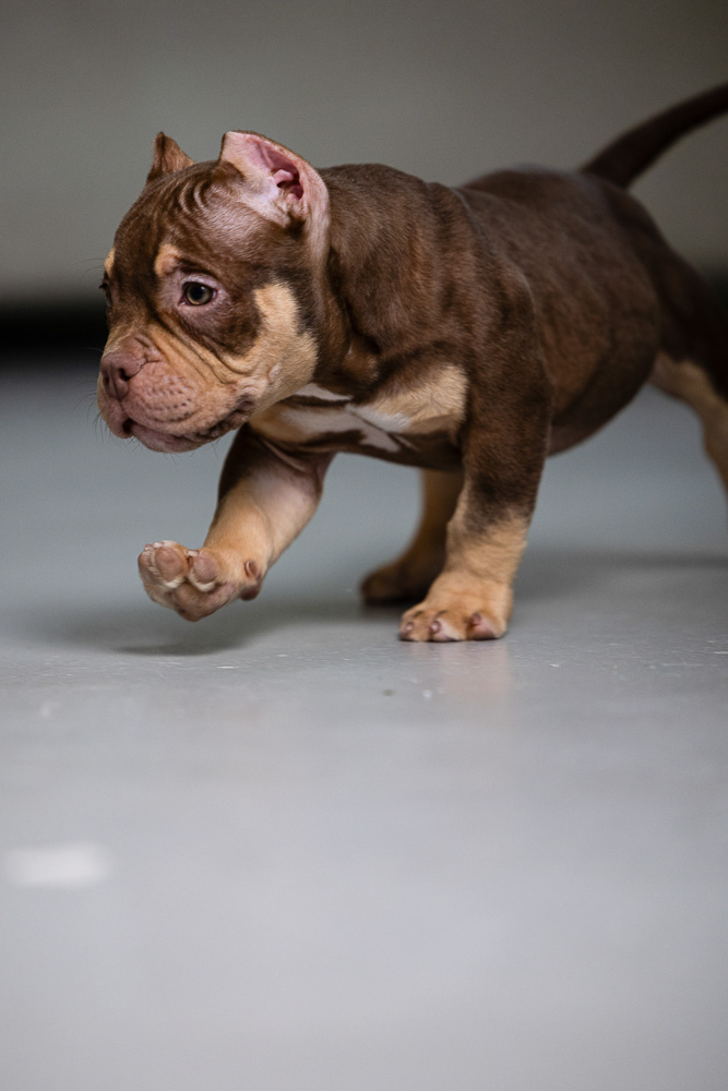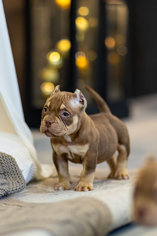 Этот мальчик – настоящая шоколадная находка! Он сочетает в себе атлетизм, выразительную мускулатуру и невероятную харизму. Уже в свои 5 месяцев он демонстрирует ярко выраженные объемы, мощные мышцы и крепкий костяк, что делает его перспективным представителем породы.