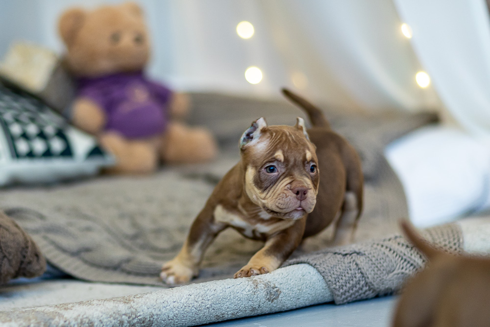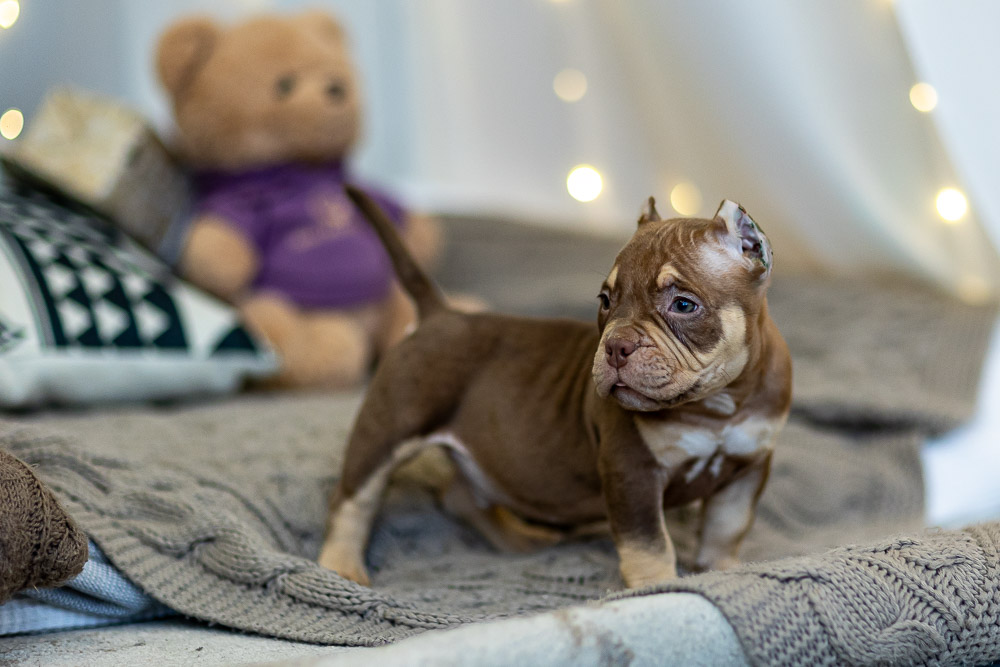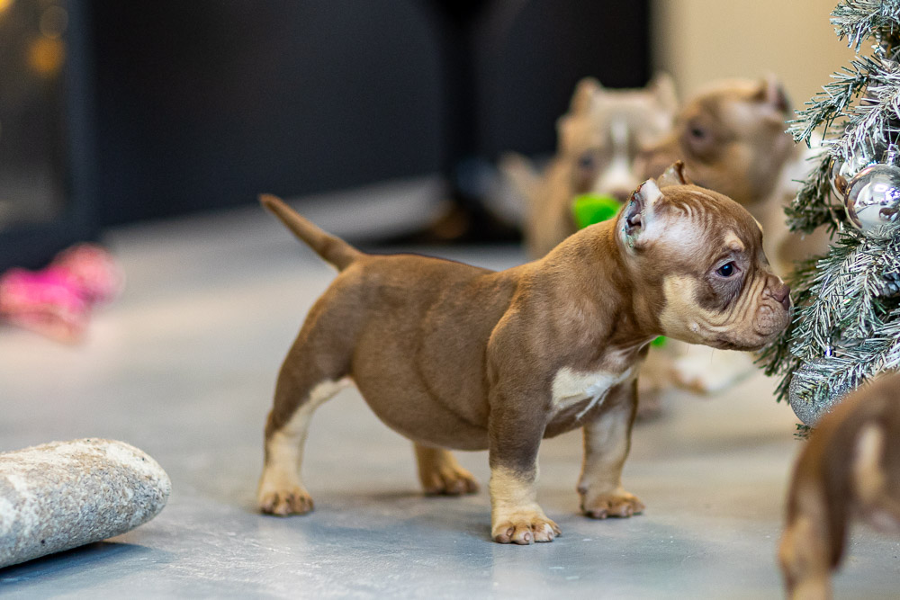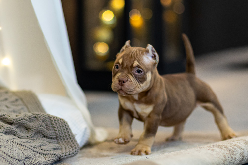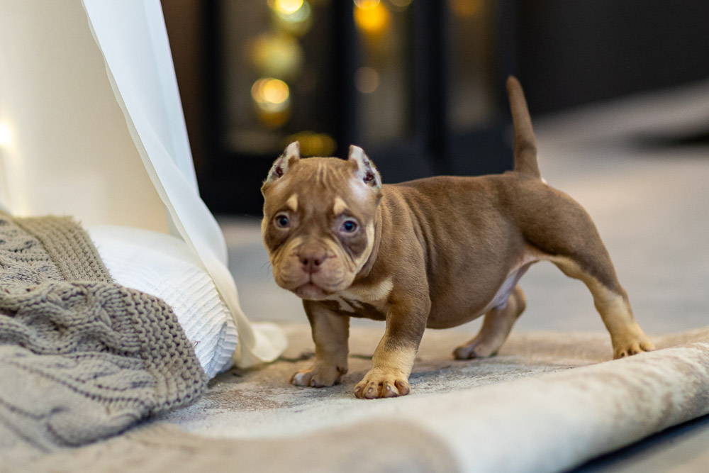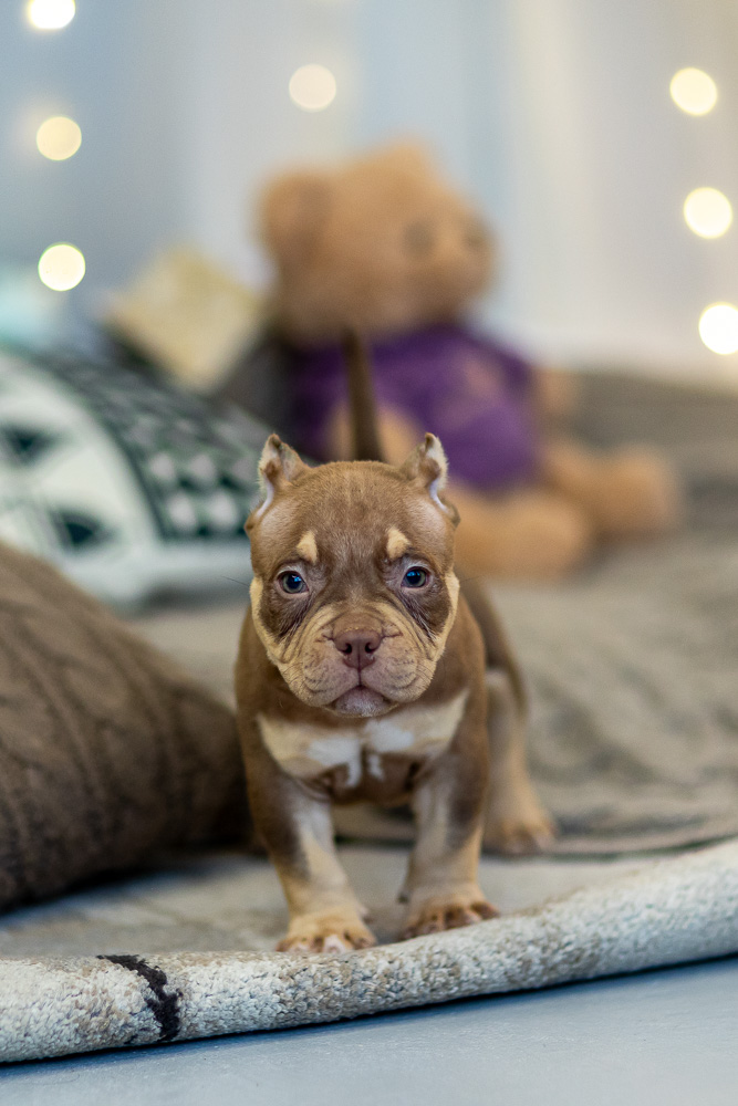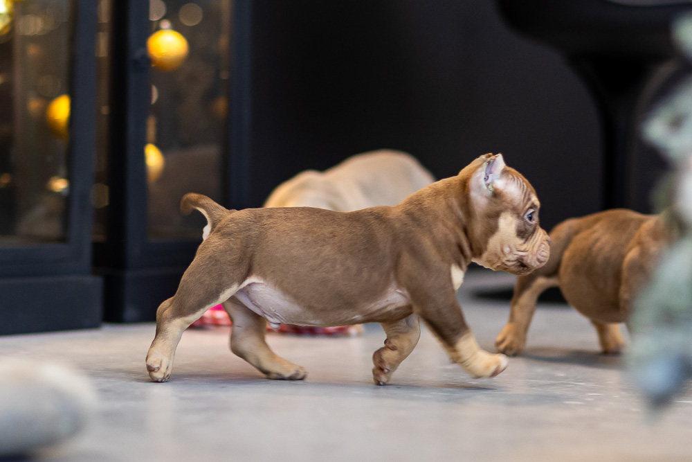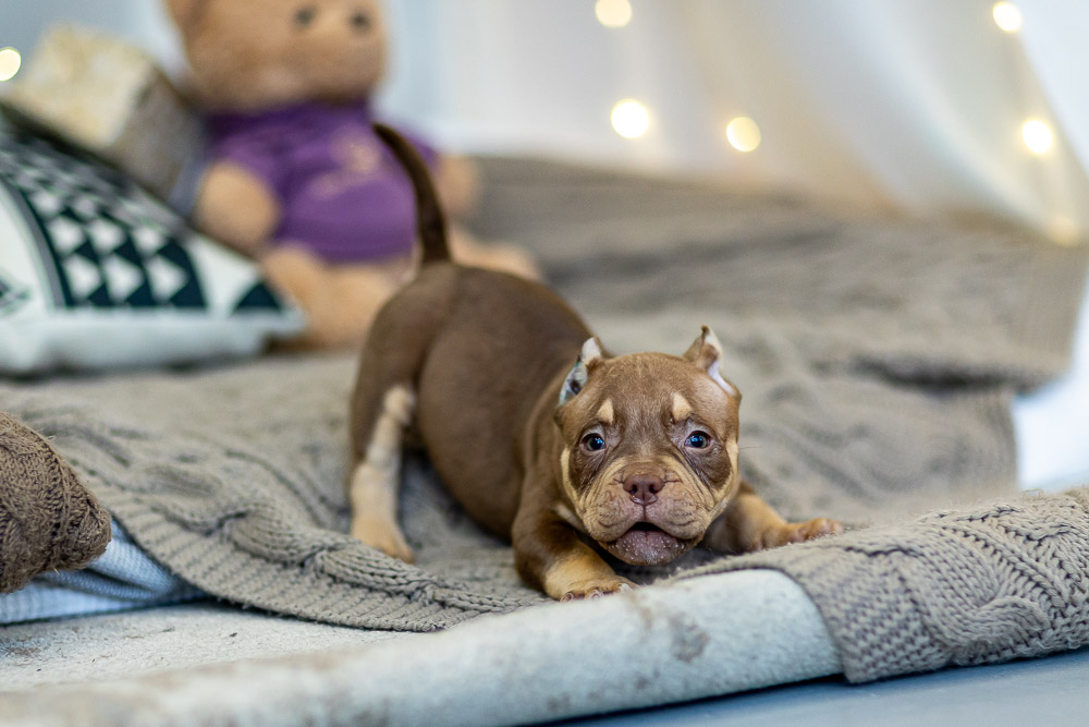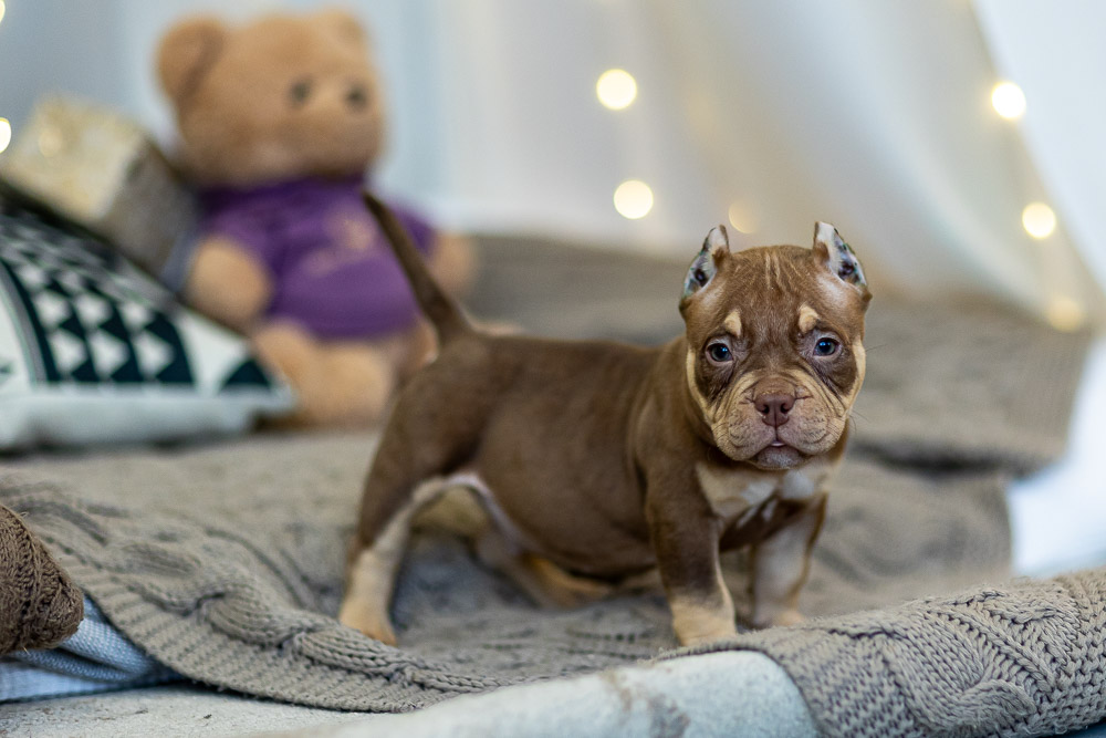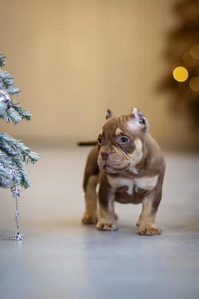 Этот мальчик – настоящая шоколадная находка! Он сочетает в себе атлетизм, выразительную мускулатуру и невероятную харизму. Уже в свои 5 месяцев он демонстрирует ярко выраженные объемы, мощные мышцы и крепкий костяк, что делает его перспективным представителем породы.