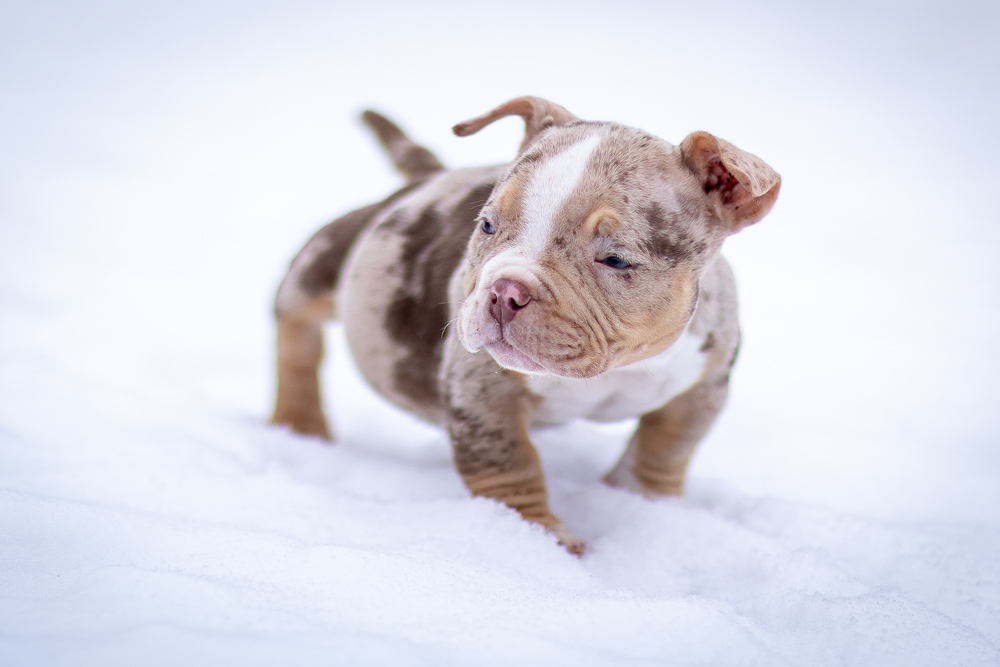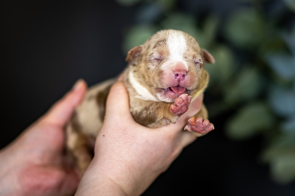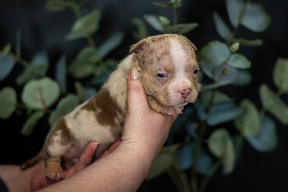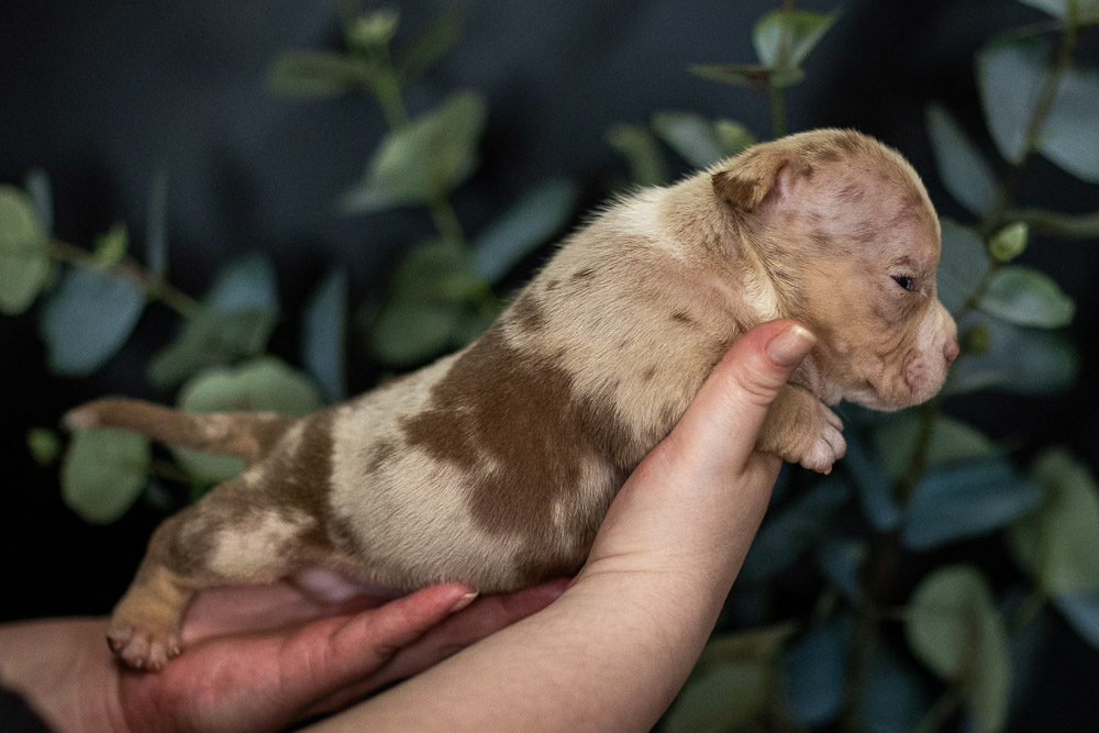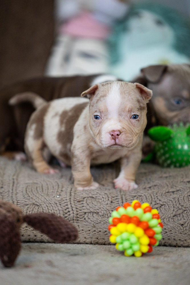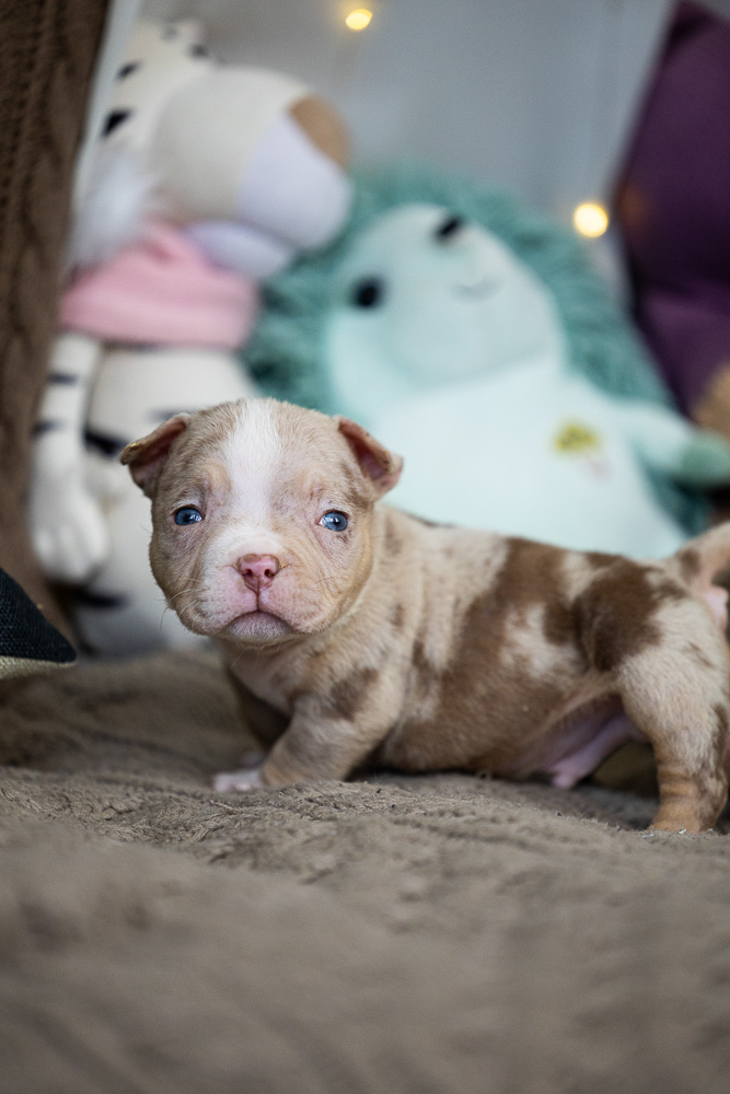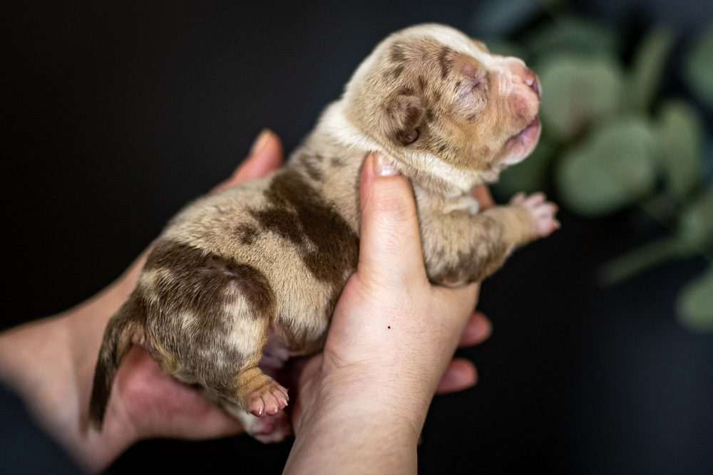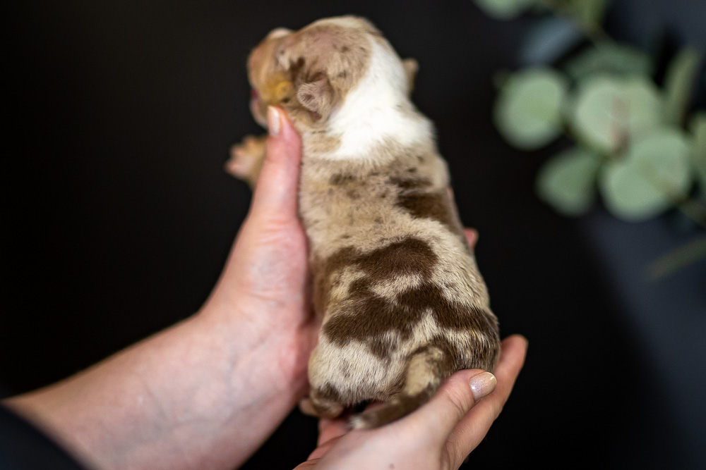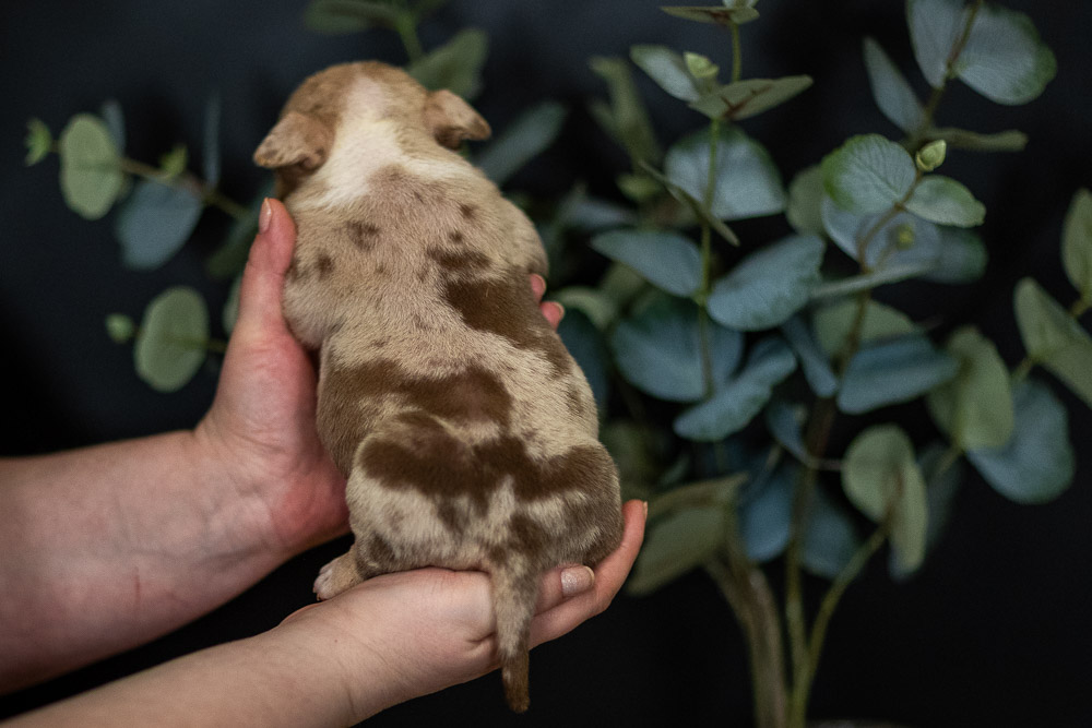 Доминик — миниатюрный малыш с уникальным окрасом шоколадный триколор мерль.