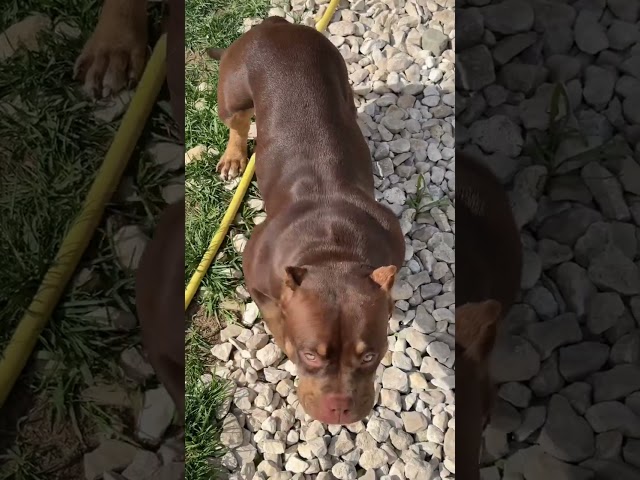 ???? Ronan Da Rhino — это эталон American Bully, один из самых миниатюрных представителей породы (всего 28 см в холке), но с невероятной массивностью и ярким шоколадным триколорным окрасом.